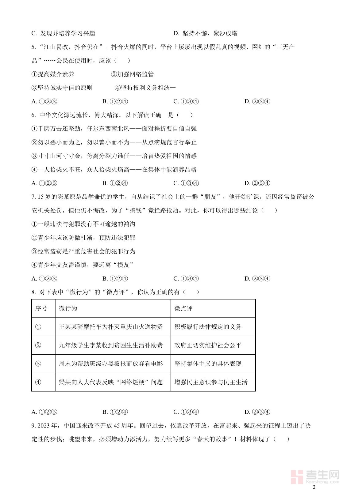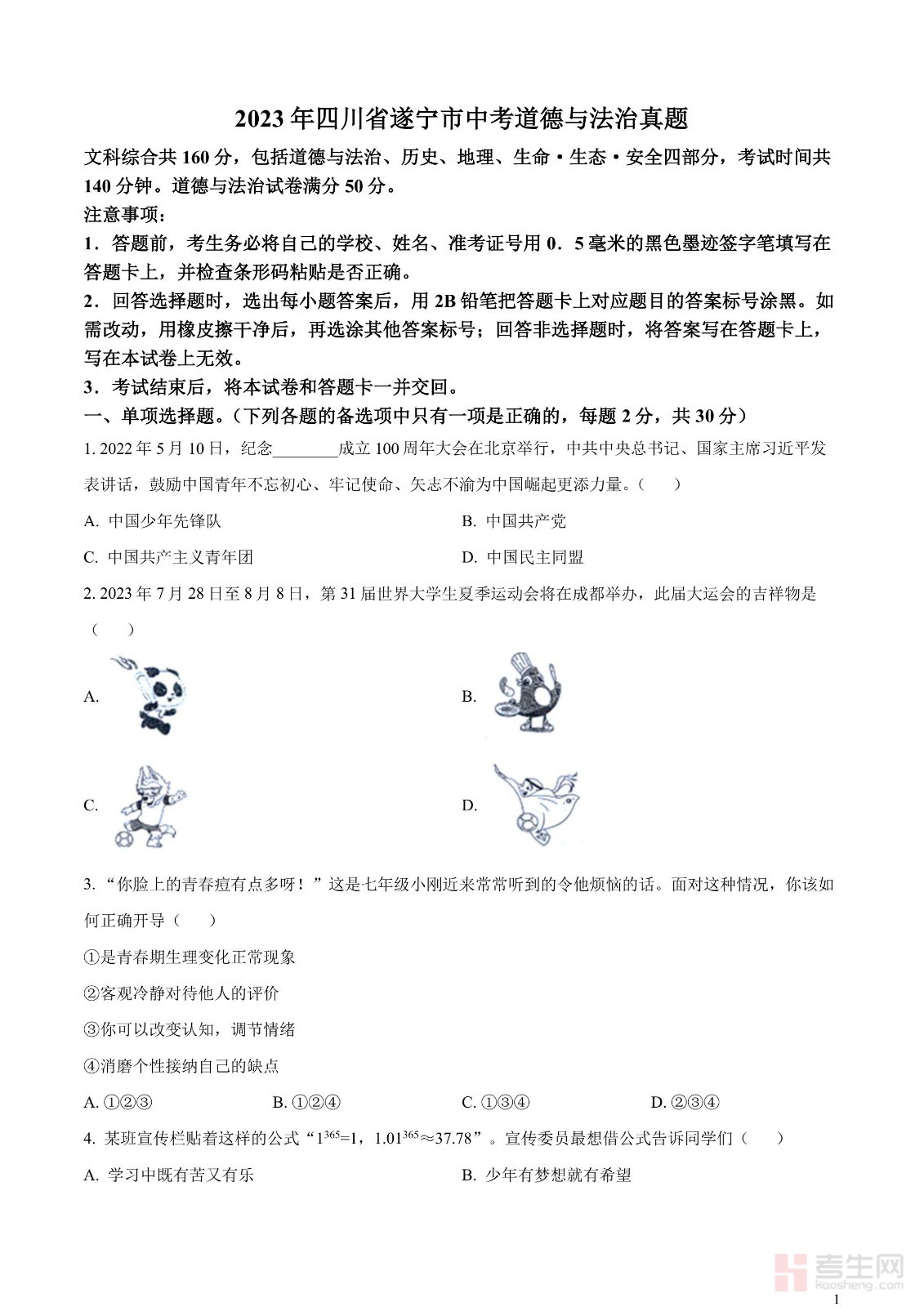 2023年四川省遂宁市中考道德与法治真题(原卷版)