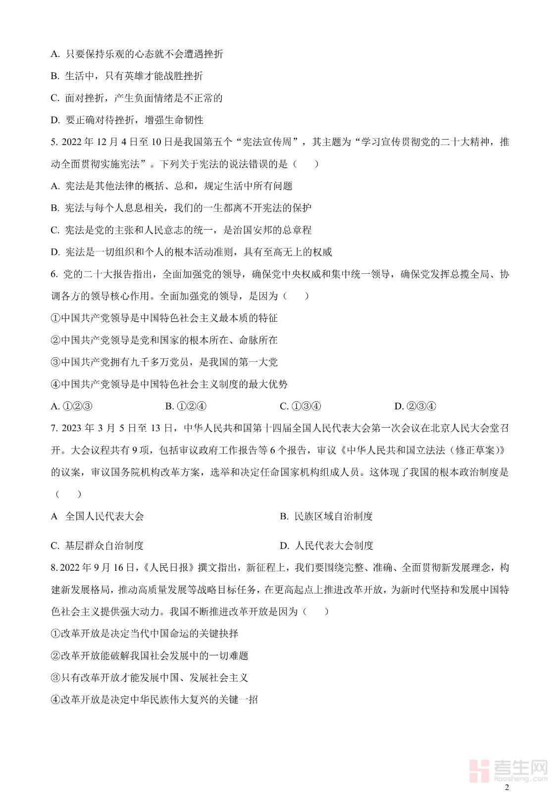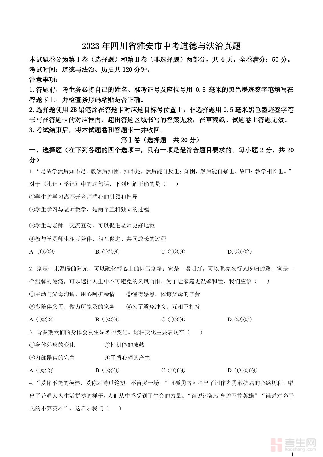 2023年四川省雅安市中考道德与法治真题(原卷版)