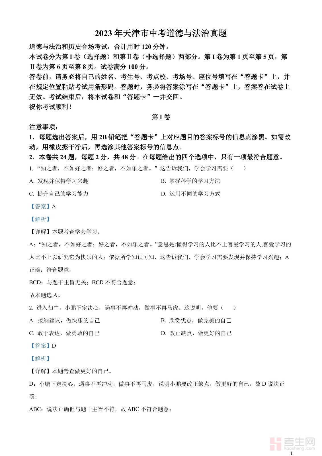 2023年天津市中考道德与法治真题(解析版)