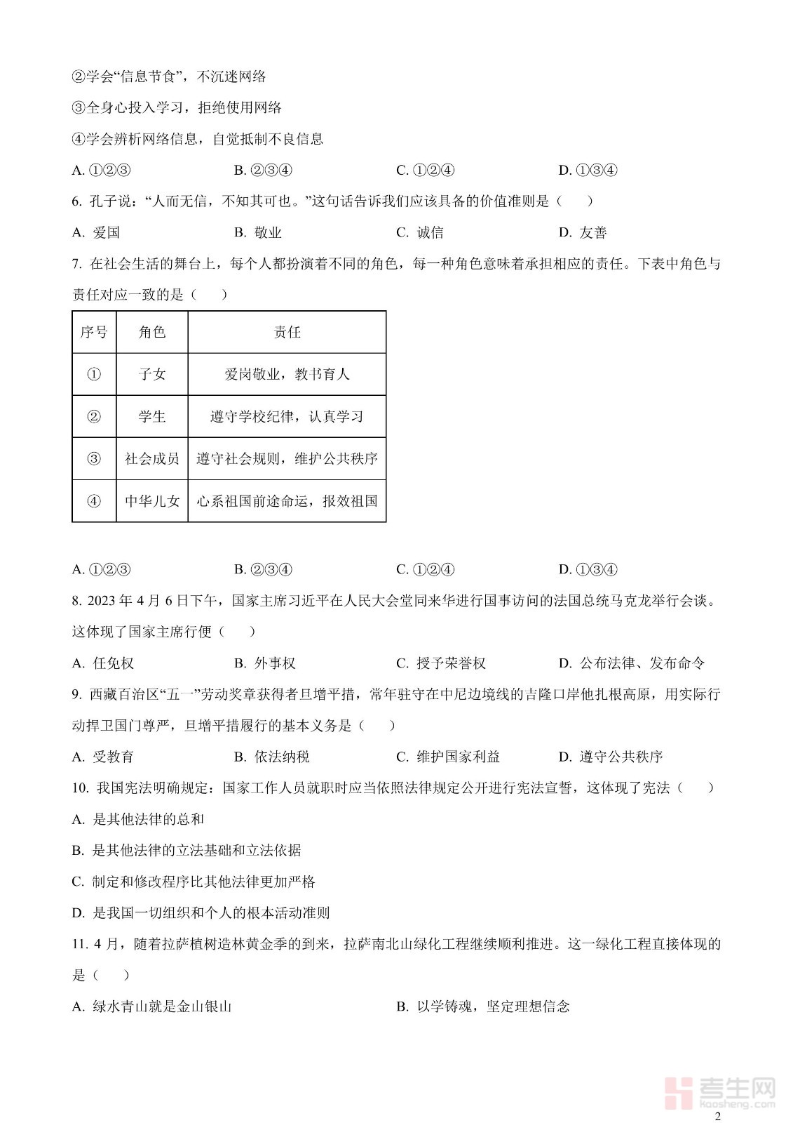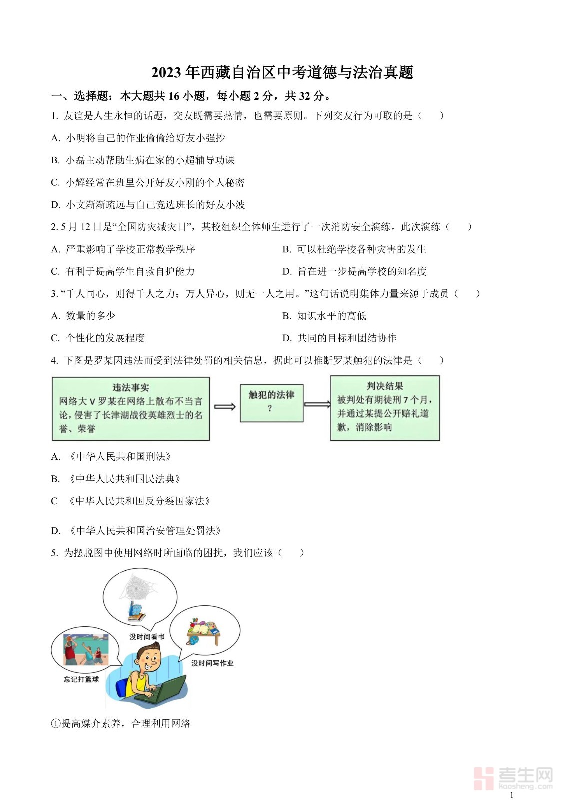 2023年西藏自治区中考道德与法治真题(原卷版)