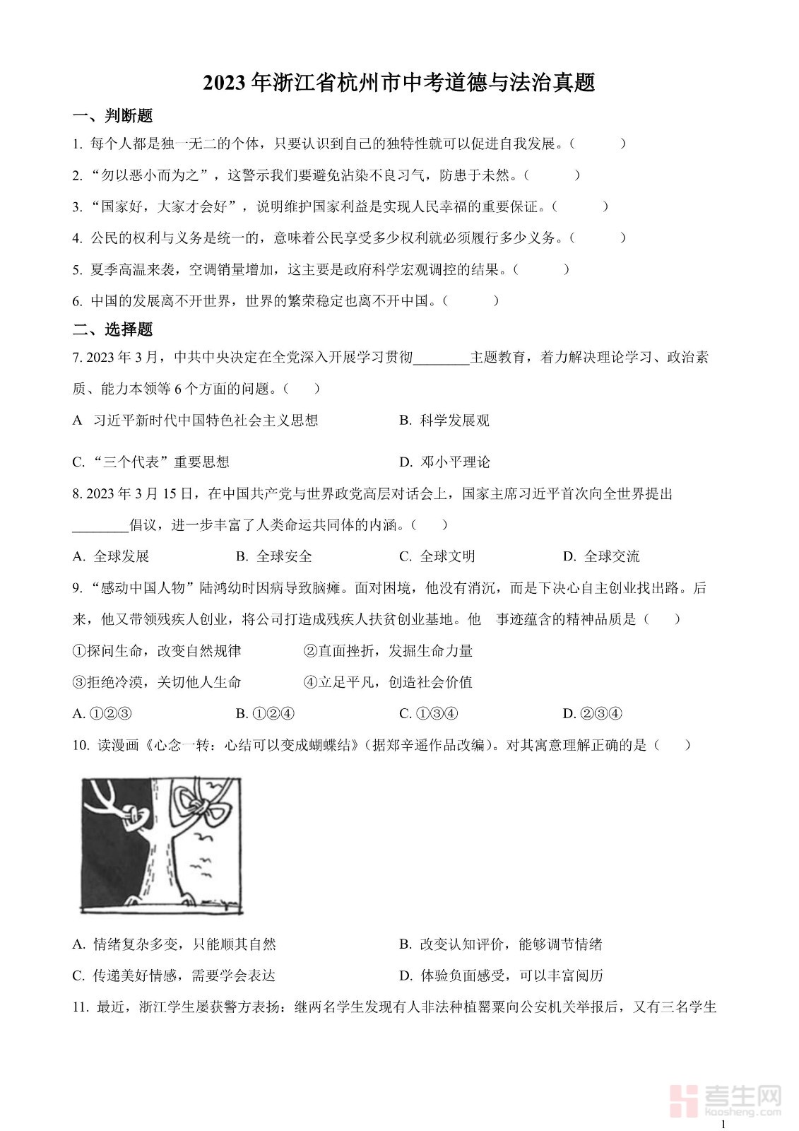 2023年浙江省杭州市中考道德与法治真题(原卷版)