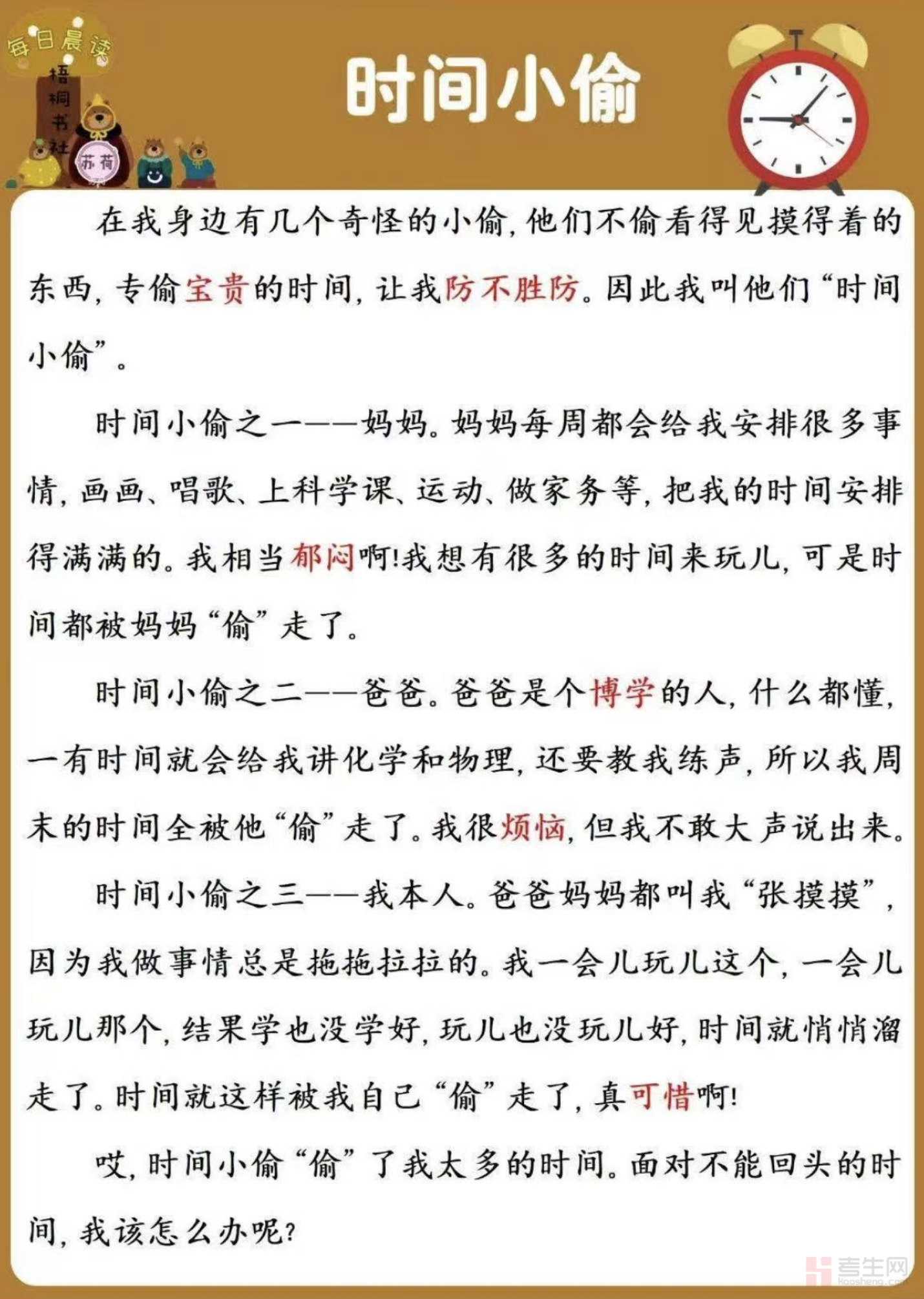 这份资料以 “时间小偷” 为核心,将抽象的时间转化为具象的场景与故事,既是晨读时引发共鸣的 “时光读本”,也是练笔时激发思考的 “创作钥匙”。在晨读部分,文字围绕 “时间小偷” 展开细腻刻画,让无形的时间变得可感可知:它可能藏在清晨赖床的几分钟里,当你不情愿地睁开眼,窗外的朝阳已悄悄升高,原本计划的晨读时光被悄悄 “偷走”;它可能躲在课间的闲聊中,与同学谈笑间,上课铃声突然响起,才发现短暂的休息时间已悄然溜走;它还可能藏在与家人相处的日常里,你低头刷手机的片刻,妈妈鬓角又多了一根白发,时间在不经意间 “偷走” 了家人的青春。文字中还融入了对不同场景下时间流逝的描写,如午后阳光下慢慢移动的影子、笔尖下逐渐减少的作业本页数、日历上一天天被划去的日期,这些细节不仅能让你在晨读时积累 “时间” 主题的写作素材,学习将抽象概念具象化的描写手法,更能唤醒你对时间的敏感度,引发对珍惜时间的思考。