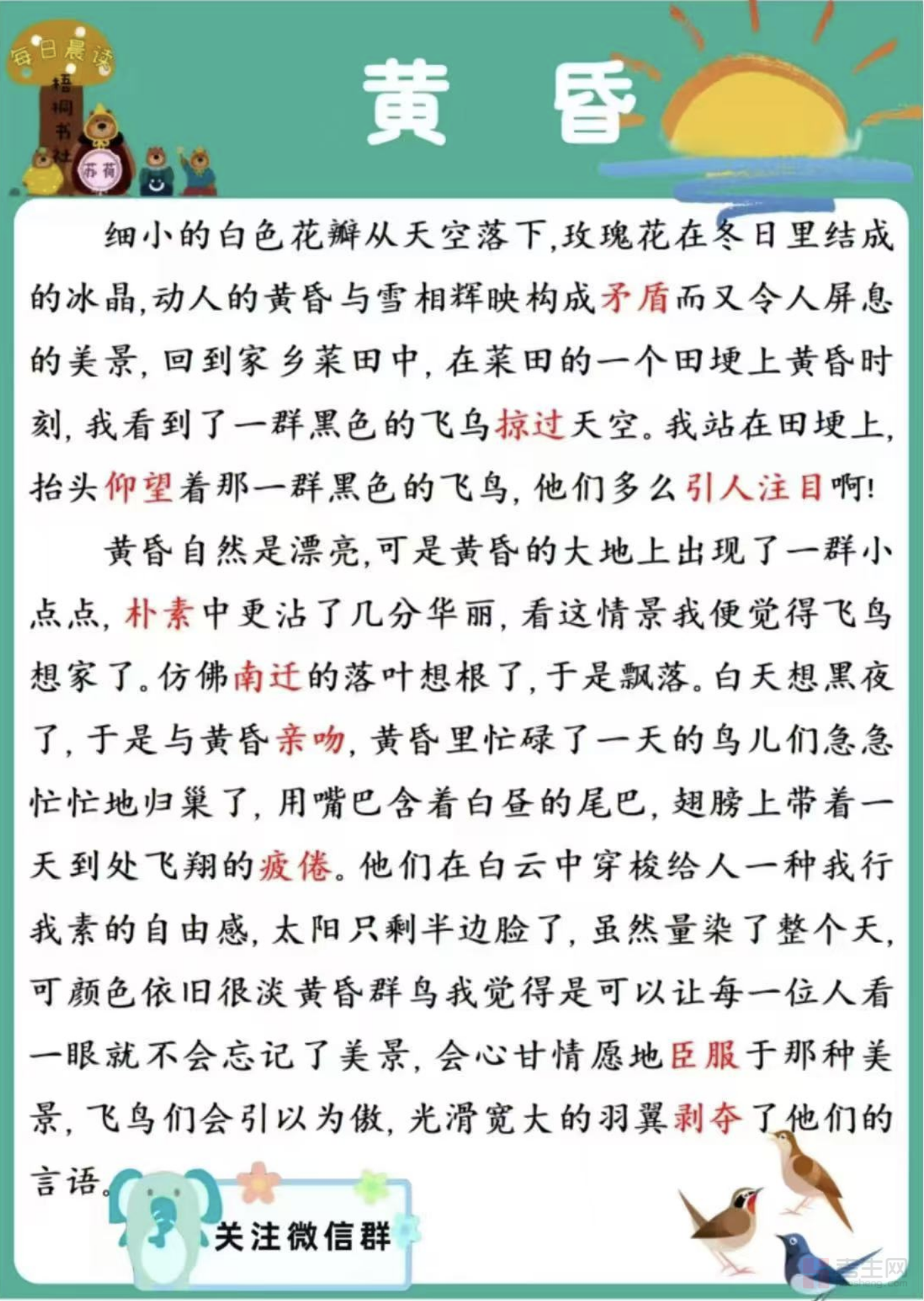 文字中还融入了黄昏里的细腻细节:夕阳下飘着的彩色气球、暮色中渐次亮起的万家灯火、晚风里带着的花草清香、人们脸上放松的神情,这些场景不仅能让你在晨读时积累 “景物”“情感”“生活” 主题的写作素材,学习 “感官描写”“氛围营造” 的手法,更能唤醒你对黄昏的记忆与共鸣,感受暮色里的温柔与治愈。