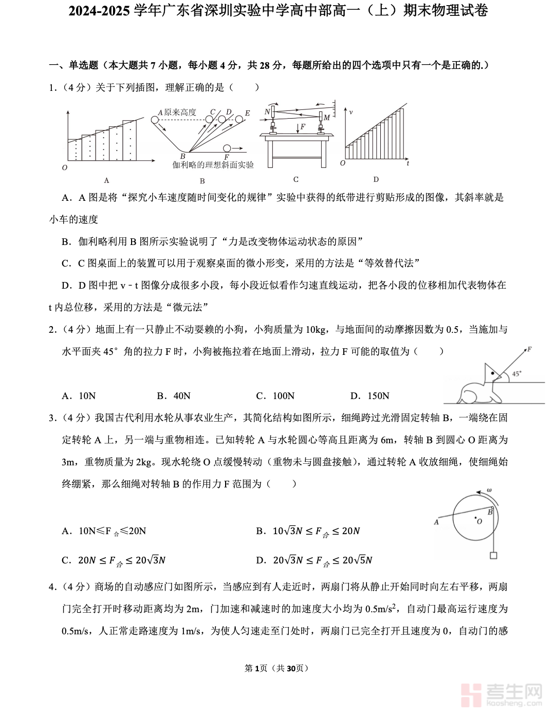 深圳高一物理期末真题 + 精解 ——Soren 老师重磅备考资料