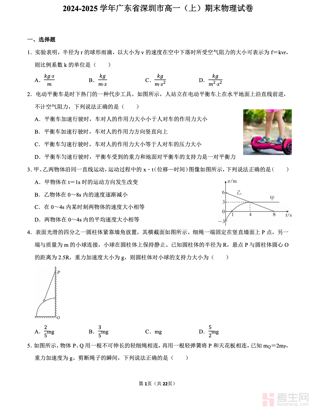 资料包含:深圳高一物理期末真题套卷(可打印)+ 逐题精细化解析(含考点标注 + 解题技巧 + 易错点提醒)