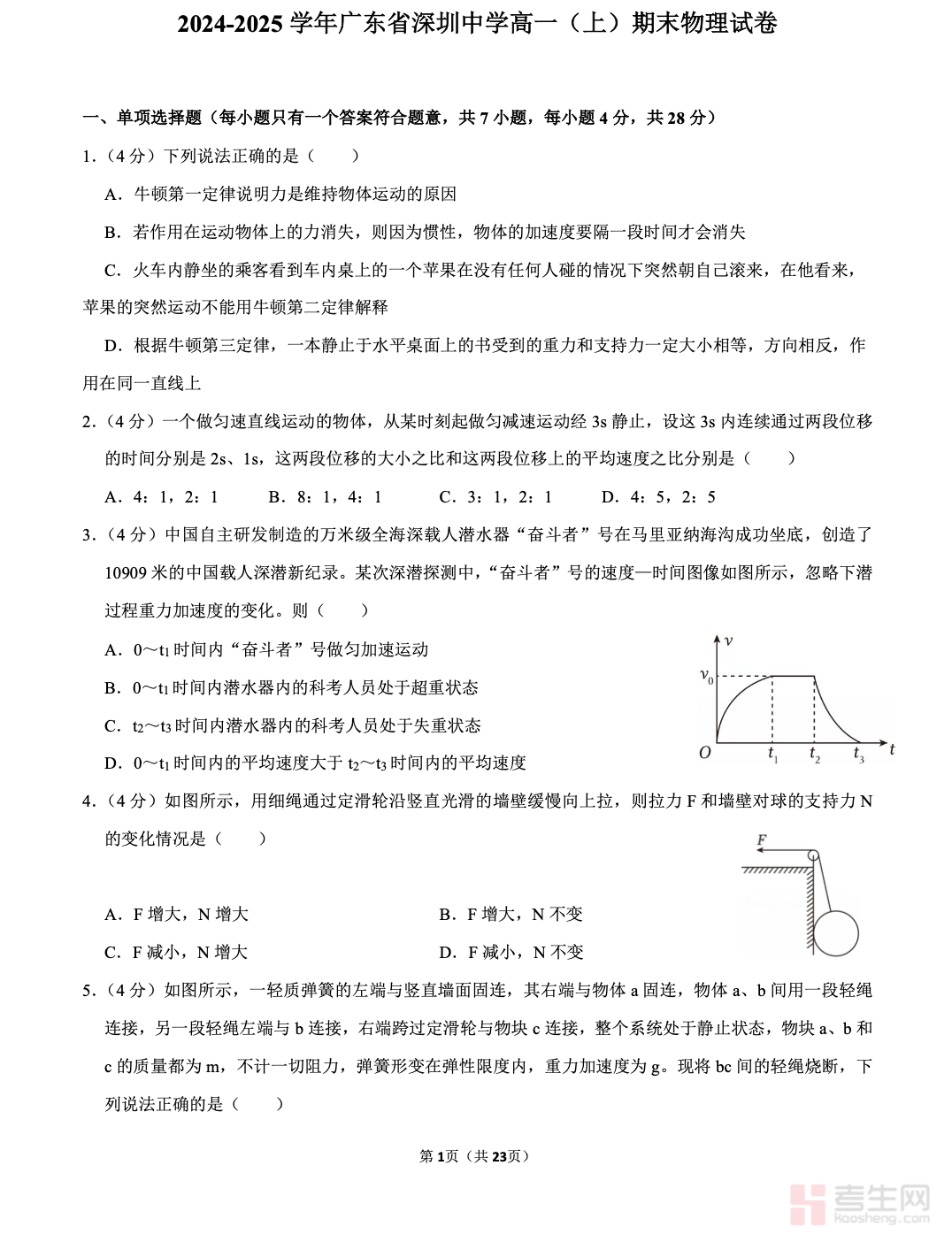 深圳高一物理期末真题 + 精解 ——Soren 老师重磅备考资料