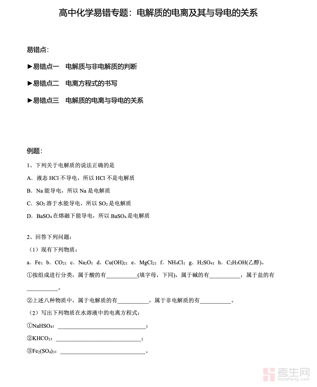 资料包含:电解质分类易错点清单、电离方程式书写技巧、导电条件辨析、典型错题解析直接登录考生网即可免费下载!