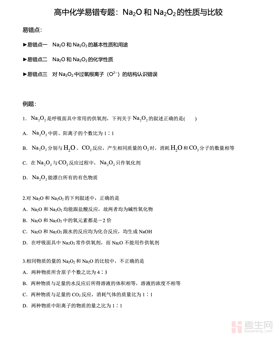 资料包含:Na₂O 与 Na₂O₂性质对比清单、易错反应方程式解析、产物判断技巧、典型真题练习直接登录考生网即可免费下载!