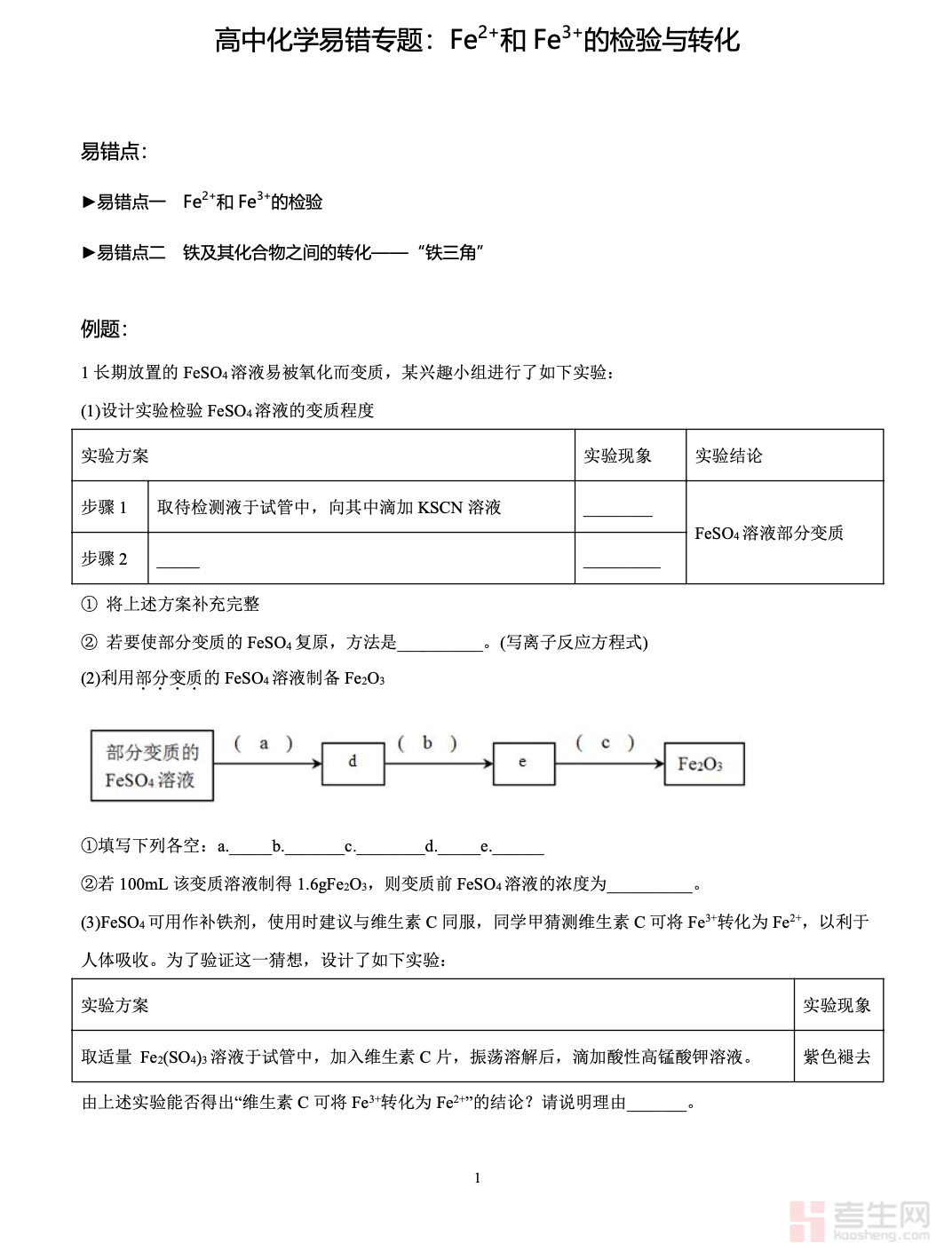 资料包含:Fe²⁺/Fe³⁺检验方法清单(含干扰排除技巧)、转化条件与氧化剂 / 还原剂汇总、易错方程式解析、典型真题 + 实验设计练习直接登录考生网即可免费下载!