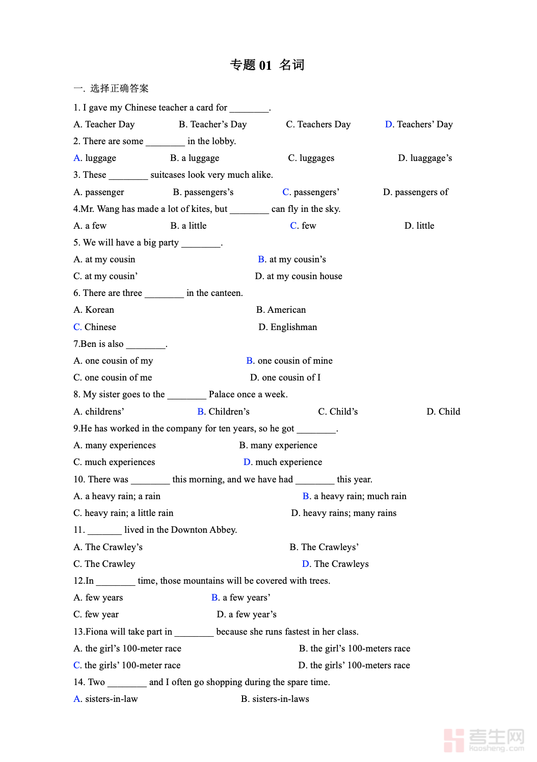 专题 01 名词(精练)—— 中职高职春季高考英语科目总复习(广东专用)