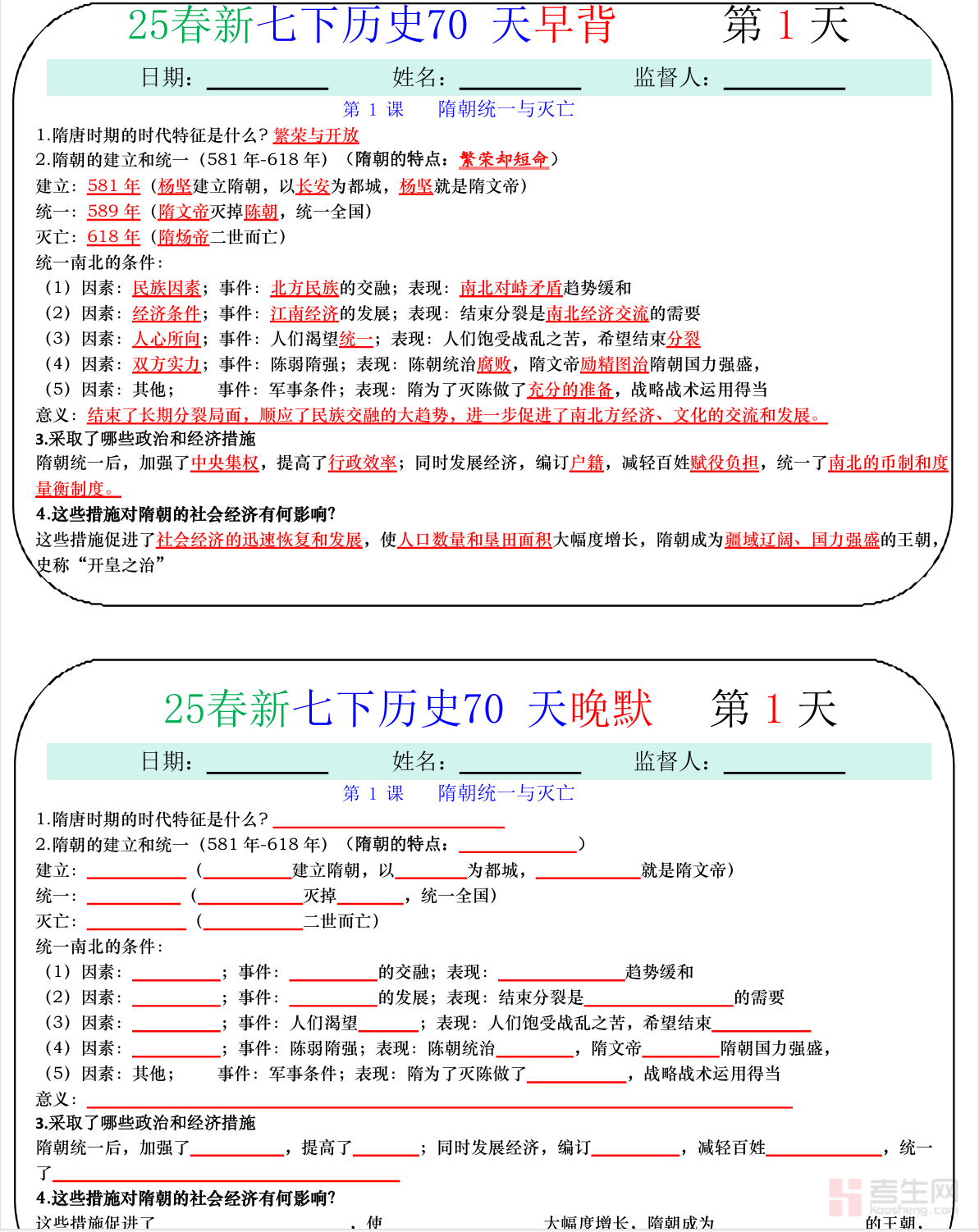 资料全覆盖教材三大核心阶段重考点:隋唐时期的繁荣与开放、辽宋夏金元时期的民族关系发展和社会变化、明清时期统一多民族国家的巩固与发展,严格贴合人教版教材编排逻辑,同步课堂学习重点,兼顾朝代脉络与核心考点。