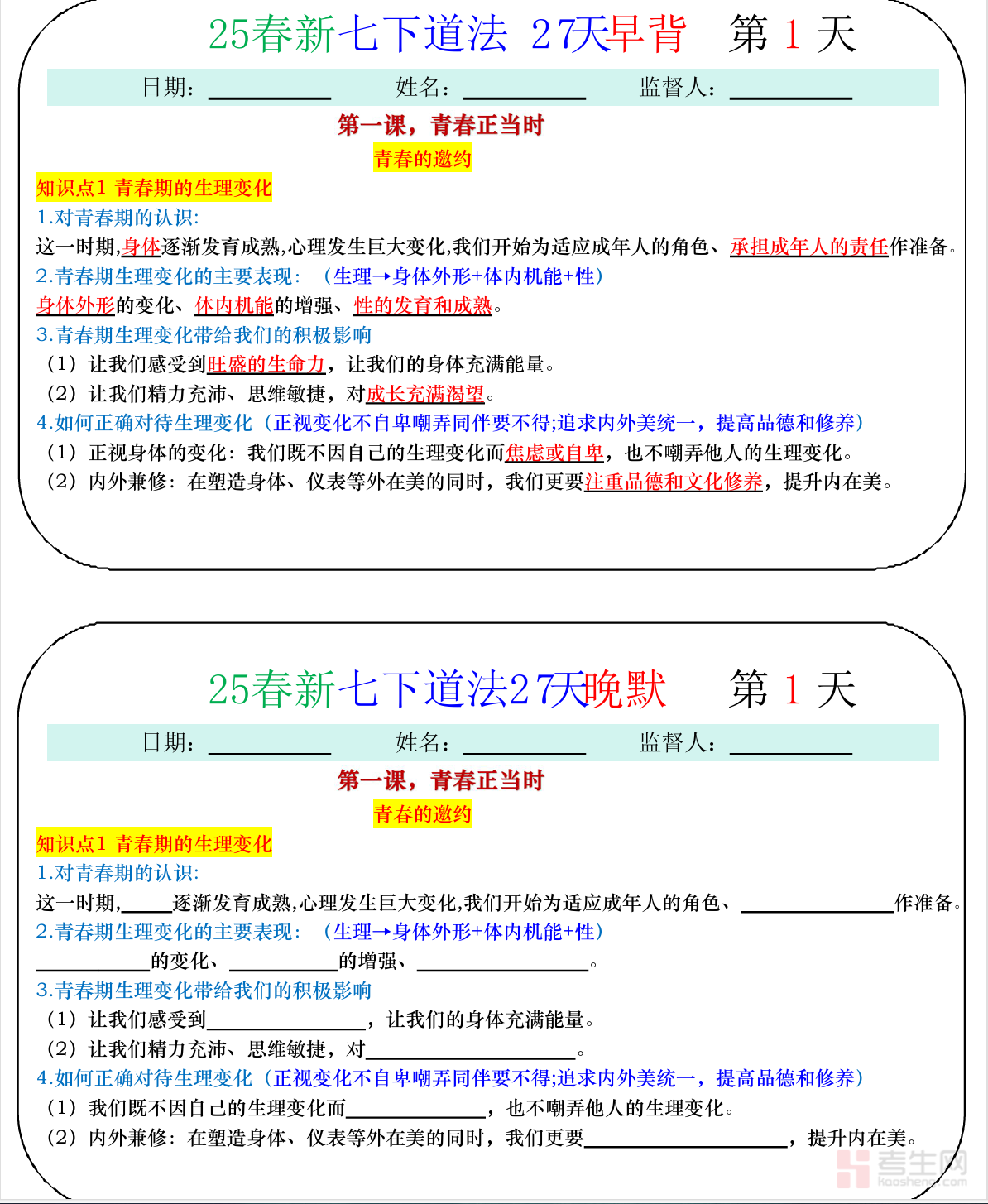 本资料专为七年级下册人教版道德与法治学习打造,聚焦教材核心重考点,经精准提炼、体系化梳理而成,适配随堂记背、单元复盘、考前速记等多种学习场景,助力高效掌握考点、夯实道法基础。