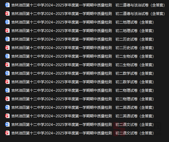### 吉林油田第十二中学2024~2025学年度第一学期期中质量检测 初二试卷(含答案)内容简介 本试卷紧扣2024~2025学年度第一学期初中二年级教学大纲要求,全面覆盖语文数学英语物理生物地理历史道德与法治等学科核心知识点,题型包含选择题填空题简答题阅读理解分析题等多种形式,注重考查学生基础知识掌握程度逻辑思维能力和综合应用能力。试卷严格按照期中质量检测标准命题,难度适中,区分度合理,既贴合日常教学重点,又能有效检验学生半学期以来的学习成效。配套答案详尽规范,每道题均标注考查要点和解题思路,方便学生自查自纠,也便于教师进行教学反馈和学情分析,是初二学生巩固知识提升应试能力的优质练习资料。