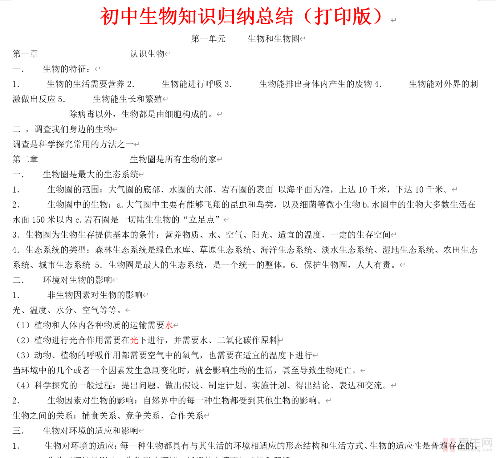 本文档为初中生物知识点归纳汇总备考资料,严格遵循初中生物课程标准,贴合七至九年级生物教材体系,全面覆盖初中生物核心知识点、实验要点、学科概念及高频考点,兼顾基础性、实验性与应试针对性,是初中生日常夯实基础、梳理知识及中考备考的必备资料。