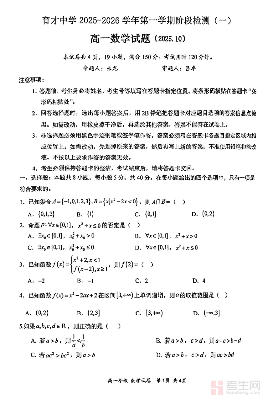 育才中学 2025-2026 学年第一学期高一数学阶段检测(一)真题试卷,精准贴合育才中学高一上学期数学教学进度,严格按照校内阶段检测要求编制,完整还原校内考情、题型分布与难度梯度,是育才中学高一学生同步检测、查漏补缺、巩固基础的优质真题资料。