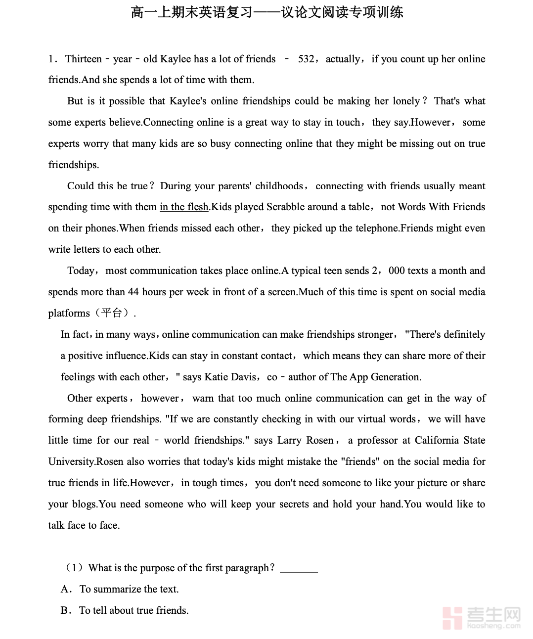 内容条理清晰、题型规范,排版简洁,每篇训练均贴合期末复习节奏,适配高一学生期末议论文阅读专项突破、日常强化练习、错题复盘、考前冲刺等场景,可作为学生自主期末复习的便捷工具,也可作为教师期末专项教学、课后辅导的辅助资料,助力高一学生夯实英语阅读基础,熟练掌握议论文阅读解题方法,高效备战期末英语考试,稳步提升阅读得分率。