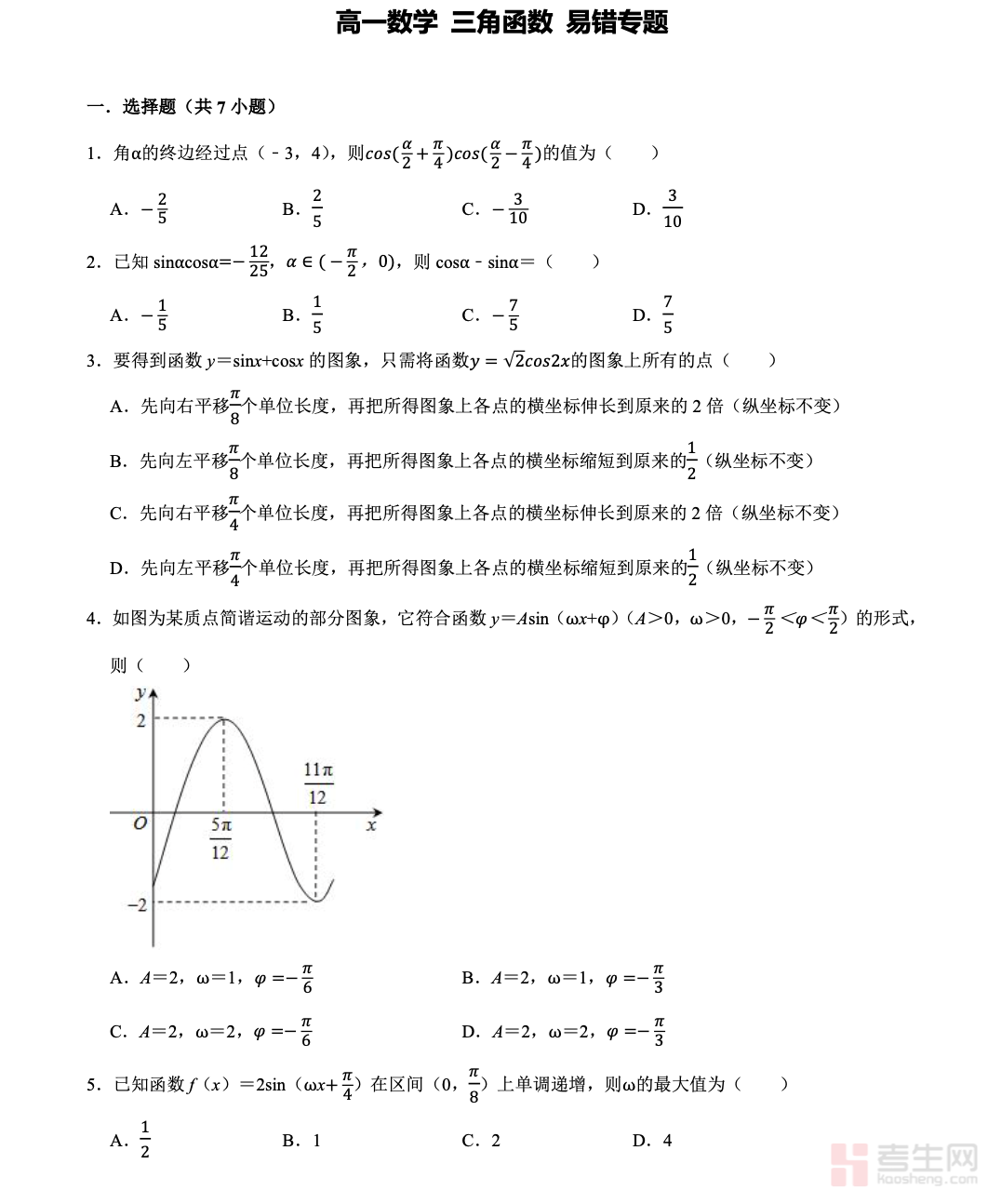 本专题紧扣高一数学三角函数考纲,贴合高一学生数学认知水平,全面梳理三角函数核心易错模块,涵盖三角函数的定义、诱导公式、同角三角函数基本关系、三角函数图像与性质、三角恒等变换等重点内容,精准提炼学生常犯易错点(诱导公式符号判断、定义域忽略、图像变换规律混淆、恒等变换公式误用等)。
