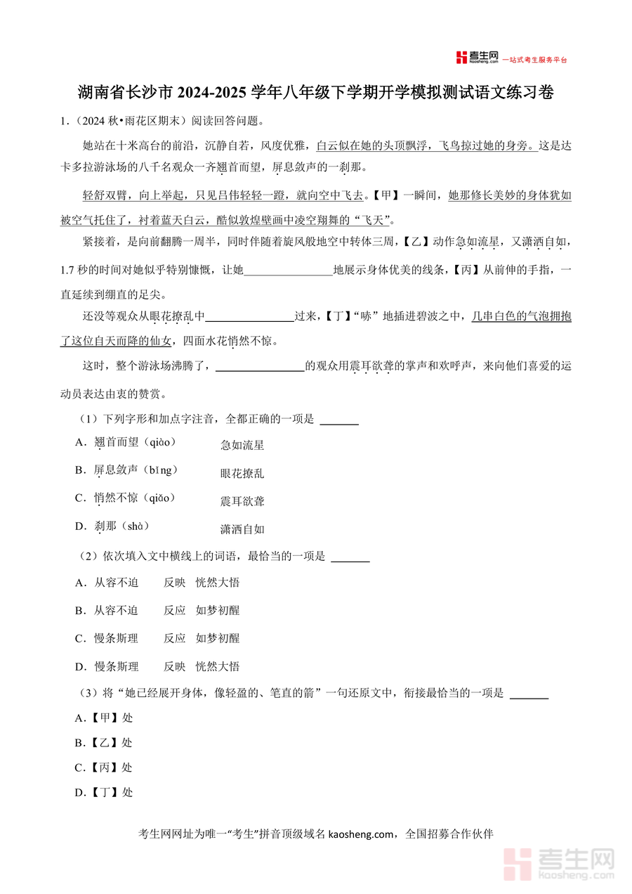 《湖南省长沙市2024-2025学年八年级下学期开学模拟测试语文练习卷.docx》是一份面向长沙市八年级学生下学期开学摸底检测的优质语文备考资料,主要涵盖基础积累与运用(字形字音辨析、词语运用、修辞判断等)、古诗文默写与阅读、文言文阅读(如苏轼传类经典文本)、现代文阅读(含文学性文本与非连续性文本)及综合性学习(文化遗产主题)等全题型,特色亮点在于结合长沙本地近年期末真题元素(如雨花区、长沙县等区域题目设计),贴合新课标要求,注重考查核心素养与应试能力的融合,能有效模拟真实考试情境