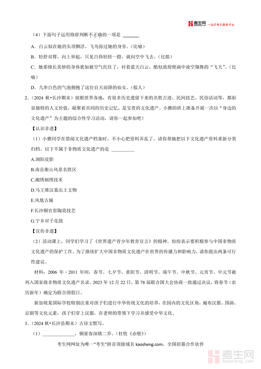 适用人群为长沙市及周边区域八年级学生,尤其是希望在开学考中取得优异成绩、巩固语文基础并提升综合素养的学生;本资料作为开学备考必备工具,其本地化考情适配性具有不可替代性,不仅能助力开学考表现,更能为后续八年级下学期及中考备考构建完整知识体系,具有长期学习价值
