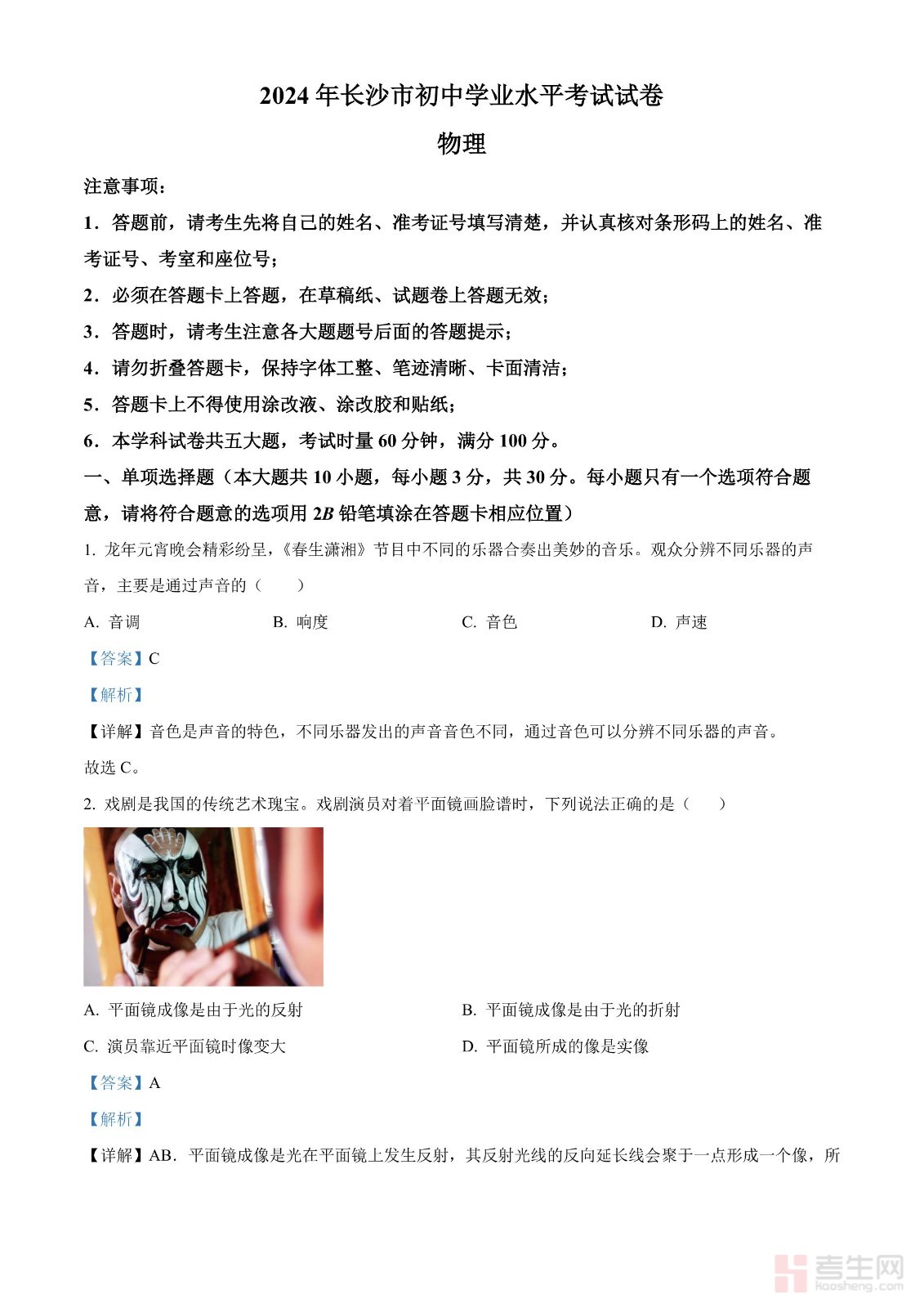 2024年长沙市初中学业水平考试试卷