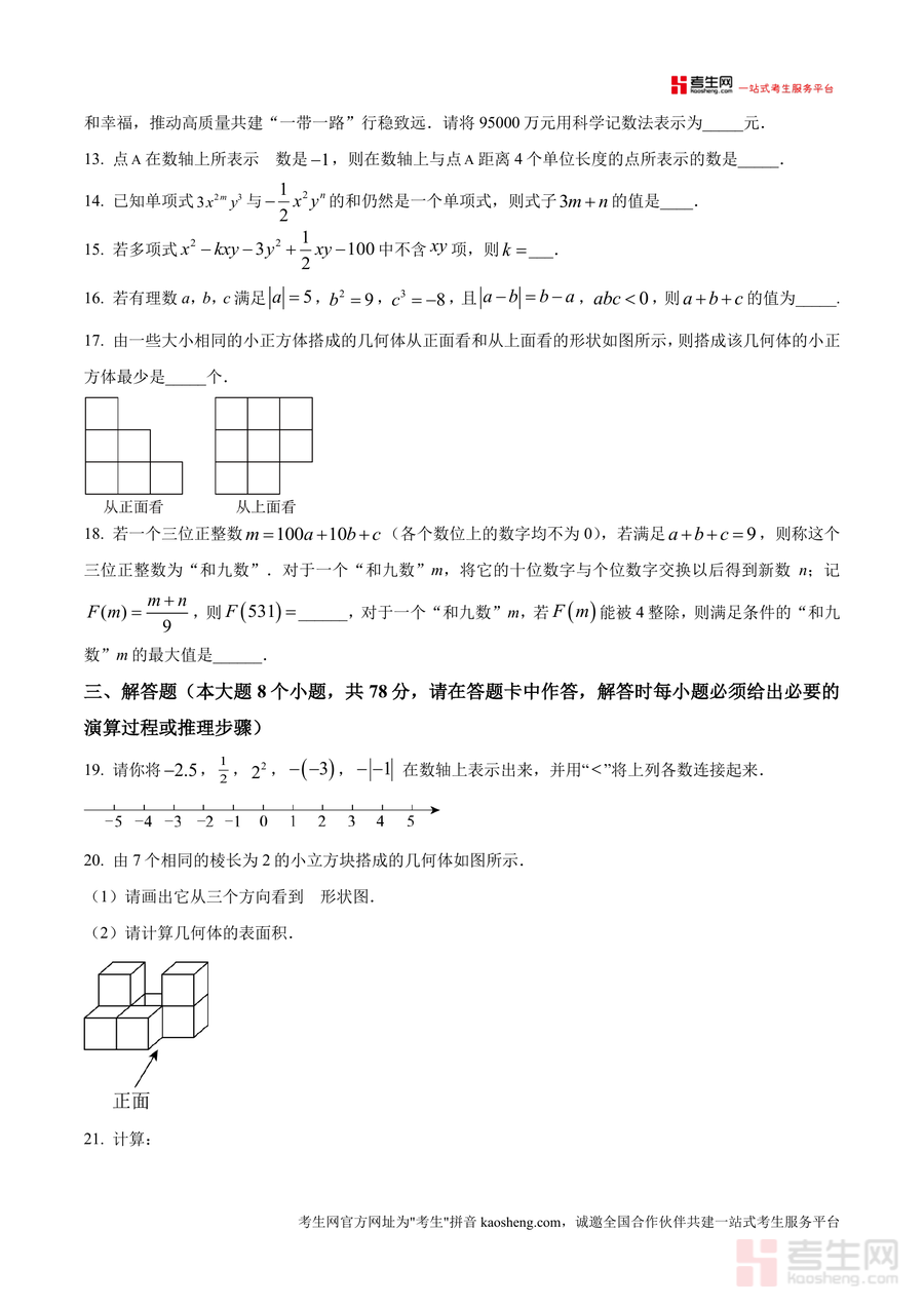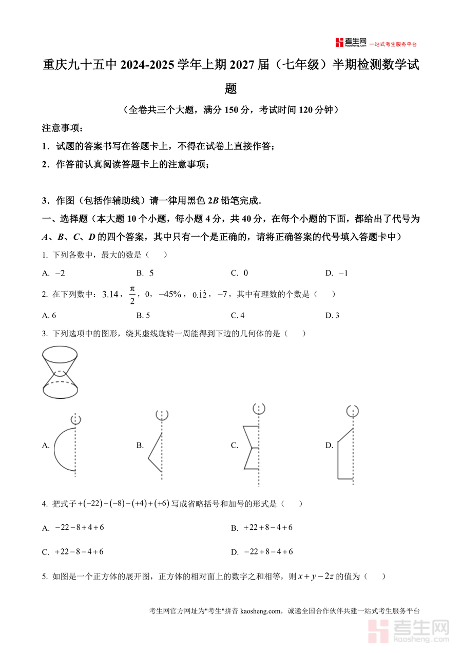 《精品解析:重庆市第九十五初级中学校2024-2025学年七年级上学期半期检测数学试题(原卷版).docx》是一份聚焦重庆九十五中七年级上学期数学学习成果检测的权威原卷资料,核心定位为真实呈现学校同期考试的命题逻辑与内容结构。主要内容包含全卷三大题型(选择题10道、填空题8道、解答题8道),满分150分,考试时长120分钟,知识点覆盖有理数运算、代数式化简求值、几何图形展开与视图、规律探究及数轴综合应用等七年级上册核心模块。特色亮点在于保留了学校命题的原汁原味,题型设置兼顾基础巩固与能力拓展,如选择第9题黑棋子规律探究、解答第26题数轴动态问题,能精准反映学生半期学习的掌握程度与命题趋势。