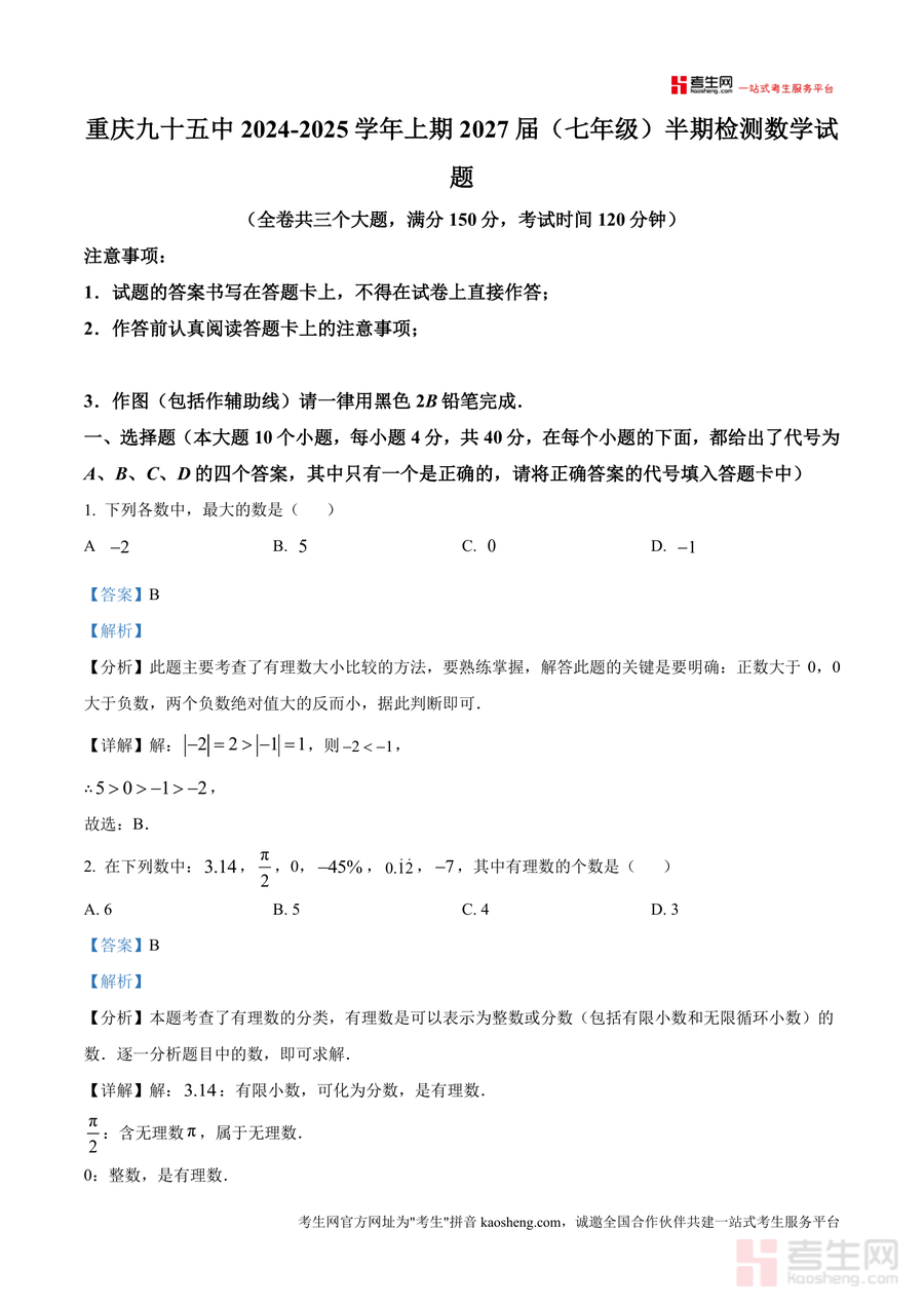 《精品解析:重庆市第九十五初级中学校2024-2025学年七年级上学期半期检测数学试题(解析版)》是一份针对该校七年级上期数学半期检测设计制作高质量真题解析备考资料,涵盖全卷三个大题共78分所有题型(选择题10道、填空题8道、解答题8道),解析内容不仅包含标准答案输出,还融入考点定位、解题思路拆解、易错点警示及同类题型拓展提示,如选择题第9题图形规律探究题,解析中明确"后一图案比前一图案多5个棋子"核心规律,帮助学生掌握此类题型解法,同时针对"和九数"等创新题型提供详细定义解读与推导过程,强化学生对新题型的适应能力。