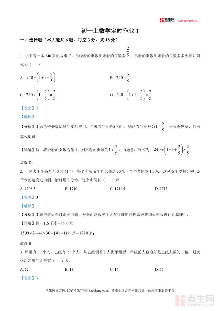 《精品解析:重庆市第十八中学2024-2025学年七年级上学期定时作业(一)数学试题(解析版).docx》是一份针对初一上学期数学阶段性学习成果检测设计的专业真题解析资料。该资料覆盖七年级数学核心知识点,包括有理数运算、一元一次方程应用、几何图形面积计算、新定义运算等模块;每道题目均配有详细解题思路分析、步骤拆解及易错点提示,如选择题中分数运算实际应用的模型构建、火车过山洞问题的路程计算逻辑,填空题中的数的整除判断与阴影面积求解,解答题中的工程问题与数轴综合应用等。其特色在于将抽象知识点与具体题型深度结合,通过真题实例帮助学生掌握解题方法,同时融入考点分布解读,为学生提供针对性学习指导。
