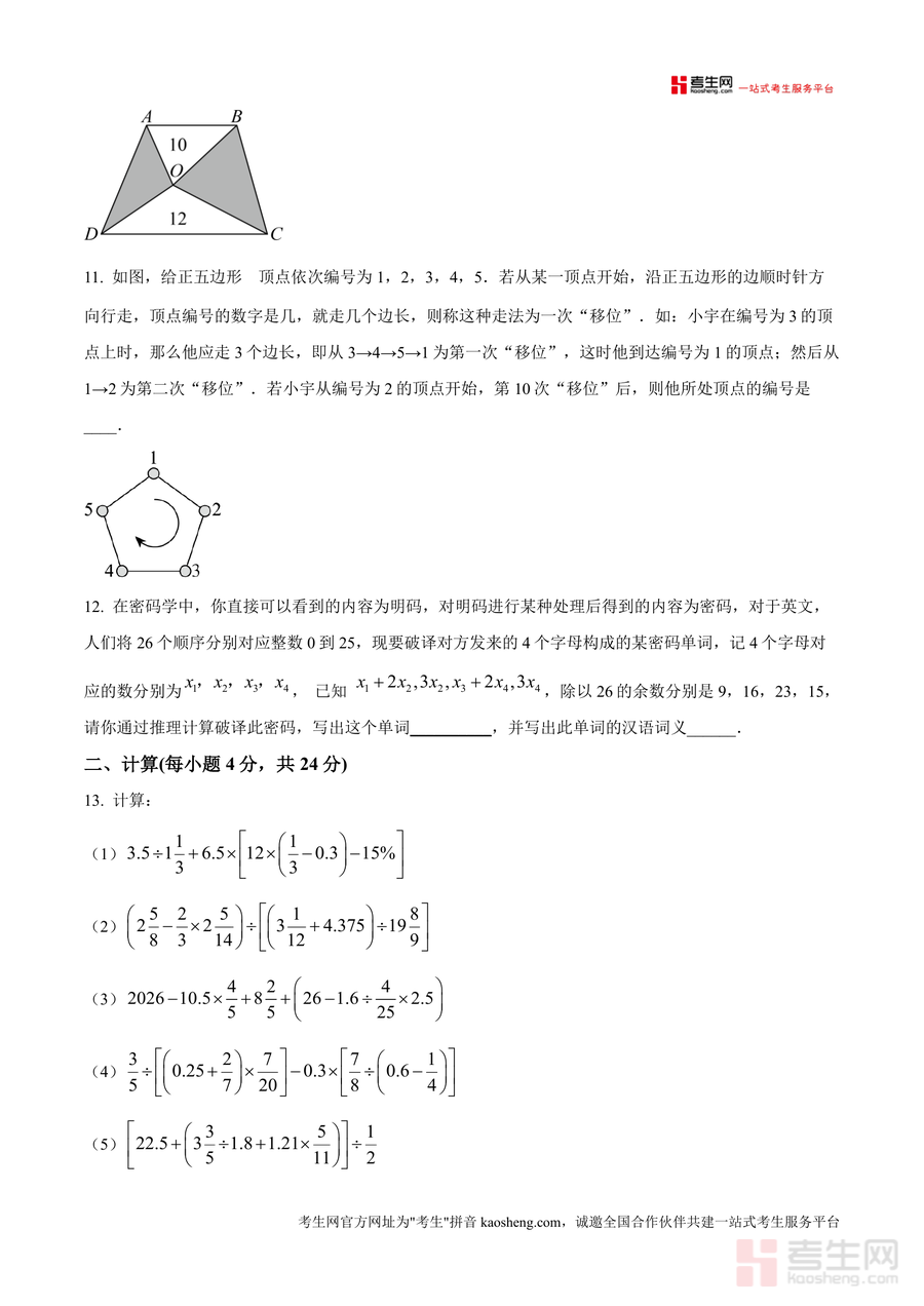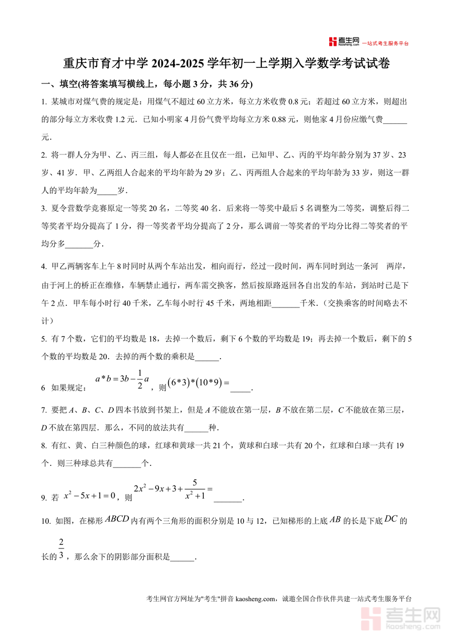 《精品解析:重庆市育才中学2024-2025学年七年级上学期入学数学考试试卷(原卷版).docx》是一份针对七年级新生入学适应性测试的权威备考资料,完整呈现了该校入学考试的题型结构与命题风格。试卷涵盖填空、计算、解答三大核心模块共18道题目,内容涉及分段计费问题、平均数计算、行程问题、排列组合、密码破译、几何图形面积等小学与初中衔接的关键知识点,具有考点覆盖全面、题目梯度合理的特色,能真实还原该校入学考试的难度与考查方向。