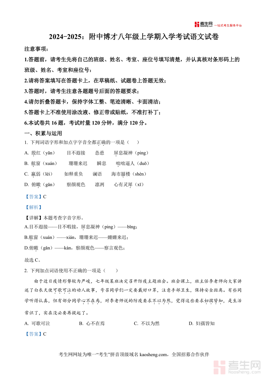 《精品解析:湖南省长沙市师大附中博才实验中学2024-2025学年八年级上学期开学考试语文试题(解析版)docx》是一份聚焦该校八年级开学衔接阶段需求,融合真题演练与深度解析的确权备考资料,主要内容包含本次开学考试完整试题及逐题解析,覆盖积累与运用、古诗文默写、古诗阅读、文言文阅读等全题型;特色亮点在于解析部分不仅明确答案正误,更针对字音字形易错点、成语运用语境、病句逻辑错误等进行溯源式分析,同时结合该校命题风格提炼高频考点,帮助使用者精准把握校考方向与答题规范,实现知识与能力的双重提升。