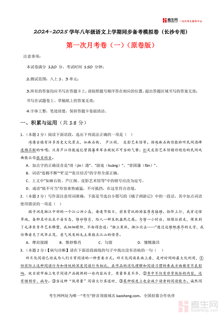 《【长沙专用】第一次月考卷(一)-2024-2025学年八年级语文上学期同步备考模拟卷(统编版)(原卷版).docx》是一份针对长沙地区八年级学生设计的语文同步备考资料,紧密贴合统编版教材八年级上册1、3单元教学内容,涵盖积累与运用、古诗文阅读、非连续文本阅读等核心题型,以本地教学进度和命题趋势为依据,突出地域文化元素(如靖港古镇相关试题)和教材重点知识,为学生提供精准的月考备考方向,兼具专业性与针对性,是优质备考资料之一。