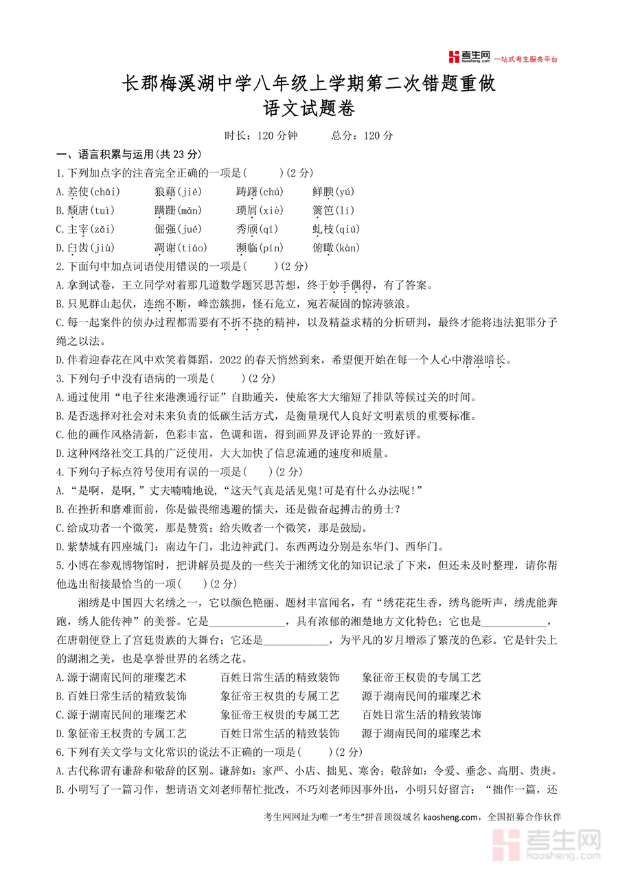 适用人群为长沙市及周边地区八年级语文学习者(尤其是希望适配名校教学节奏、提升语文成绩者)、初中语文教师(用于教学质量检测或试题资源补充);该文件具有不可替代的必要性,因其是名校真实月考真题,能客观反映学生阶段性学习水平,长期价值在于帮助学生积累规范答题技巧,培养语文核心素养(如阅读理解与文化感知能力),为后续中考备考构建扎实知识体系,是八年级语文学习与备考过程中不可或缺的优质资料.