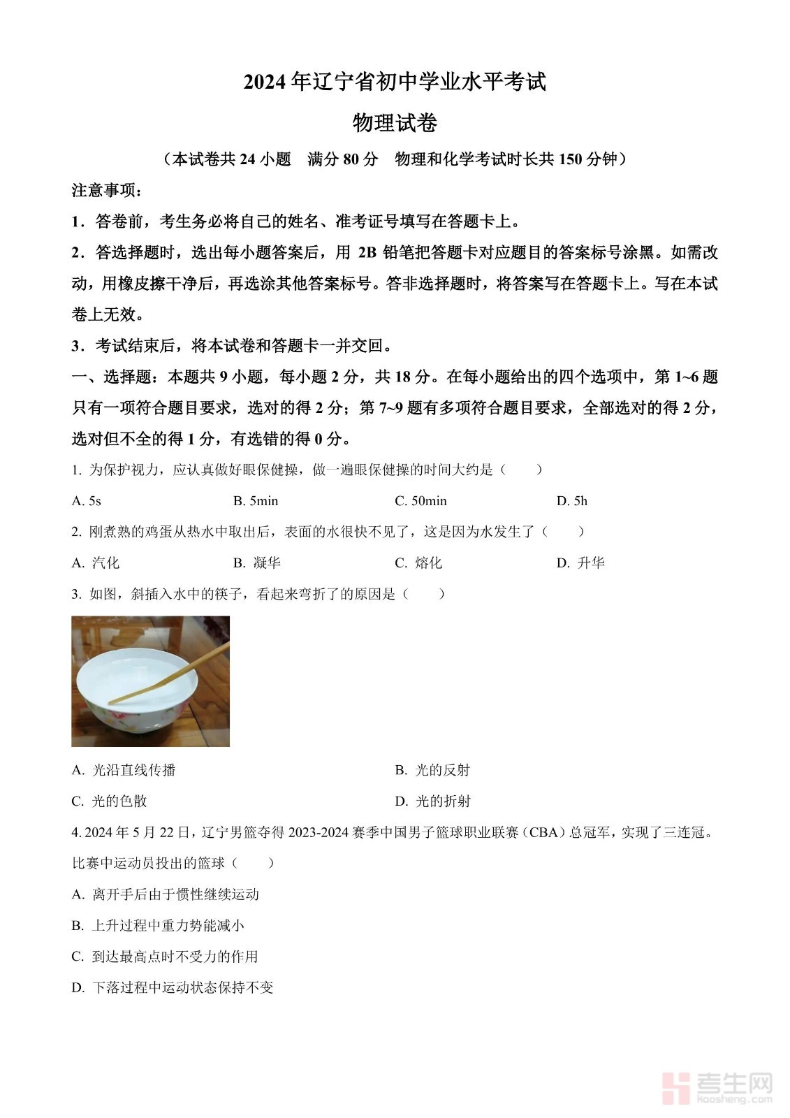 2024年辽宁省初中学业水平考试