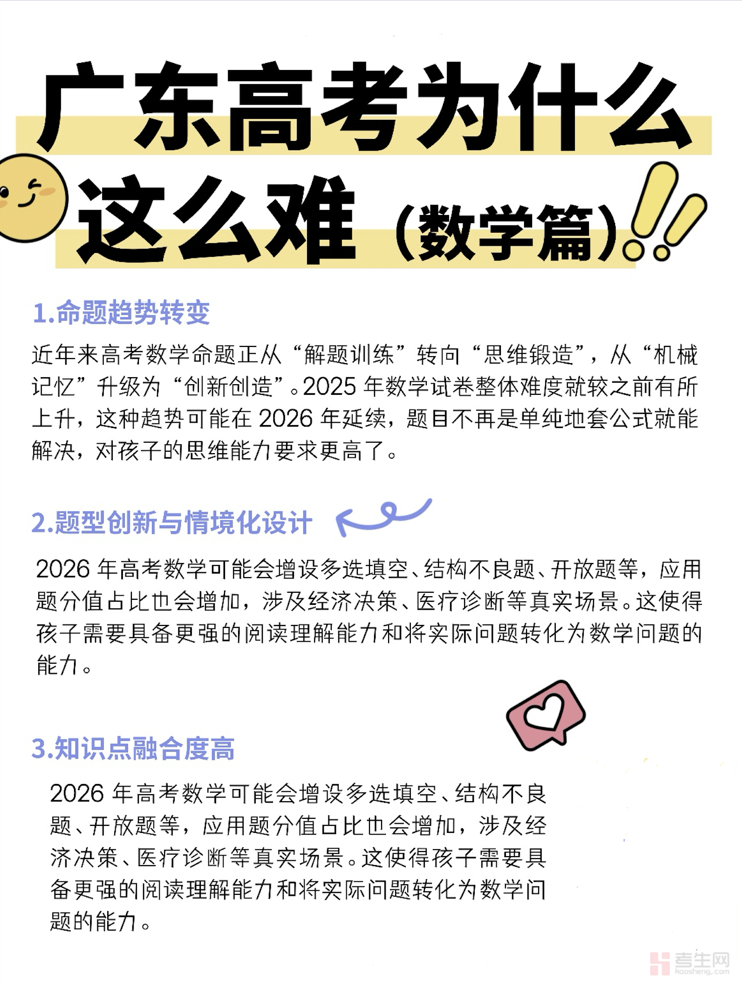 2026 年广东高考数学可能增设多选填空、结构不良题、开放题,应用题还会融入经济决策、医疗诊断等真实场景,对 “阅读理解 + 实际问题数学化” 能力要求极高。