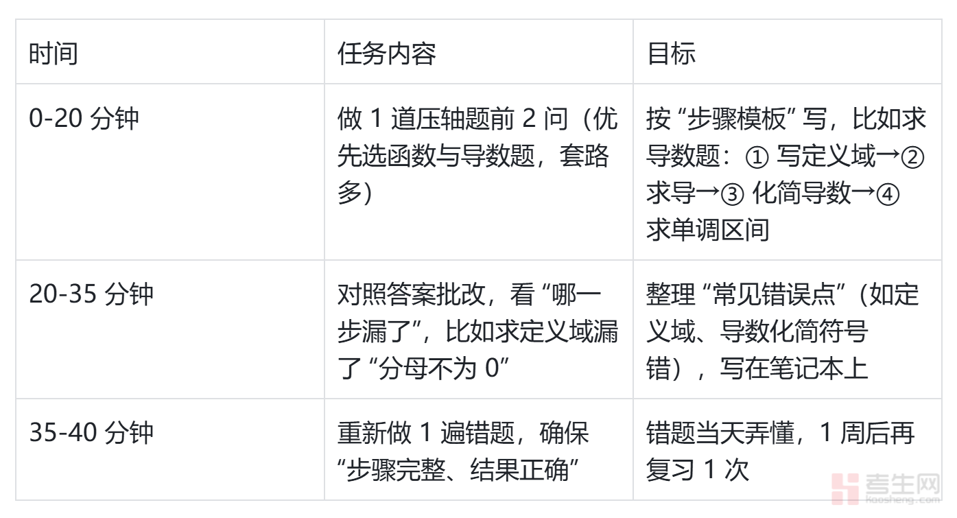 任务:每天用 15 分钟做 1 道压轴题前 2 问,10 分钟检查 “步骤是否完整、计算是否正确”;