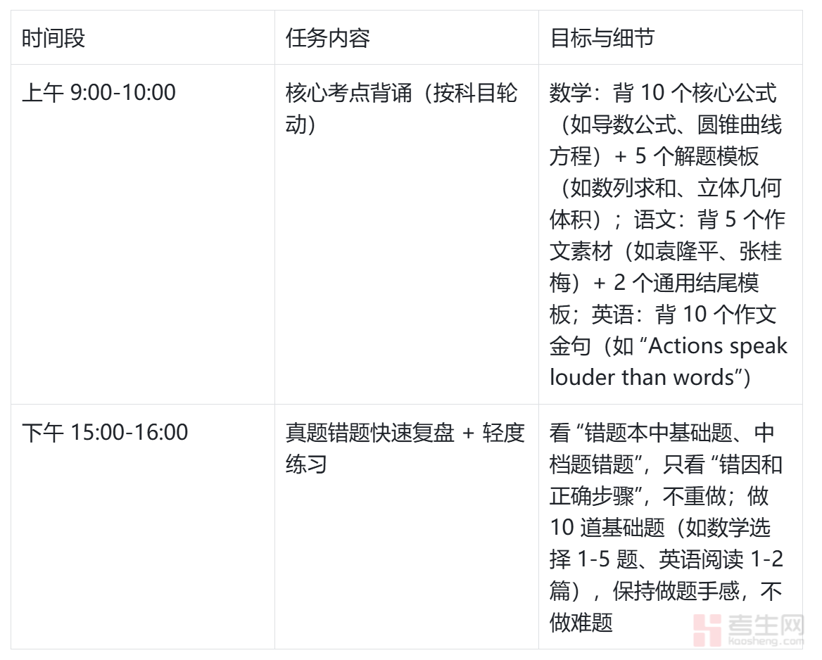 调整作息,和考试时间同步(如高考 9:00 开考,每天 9:00 开始学习,让大脑兴奋);