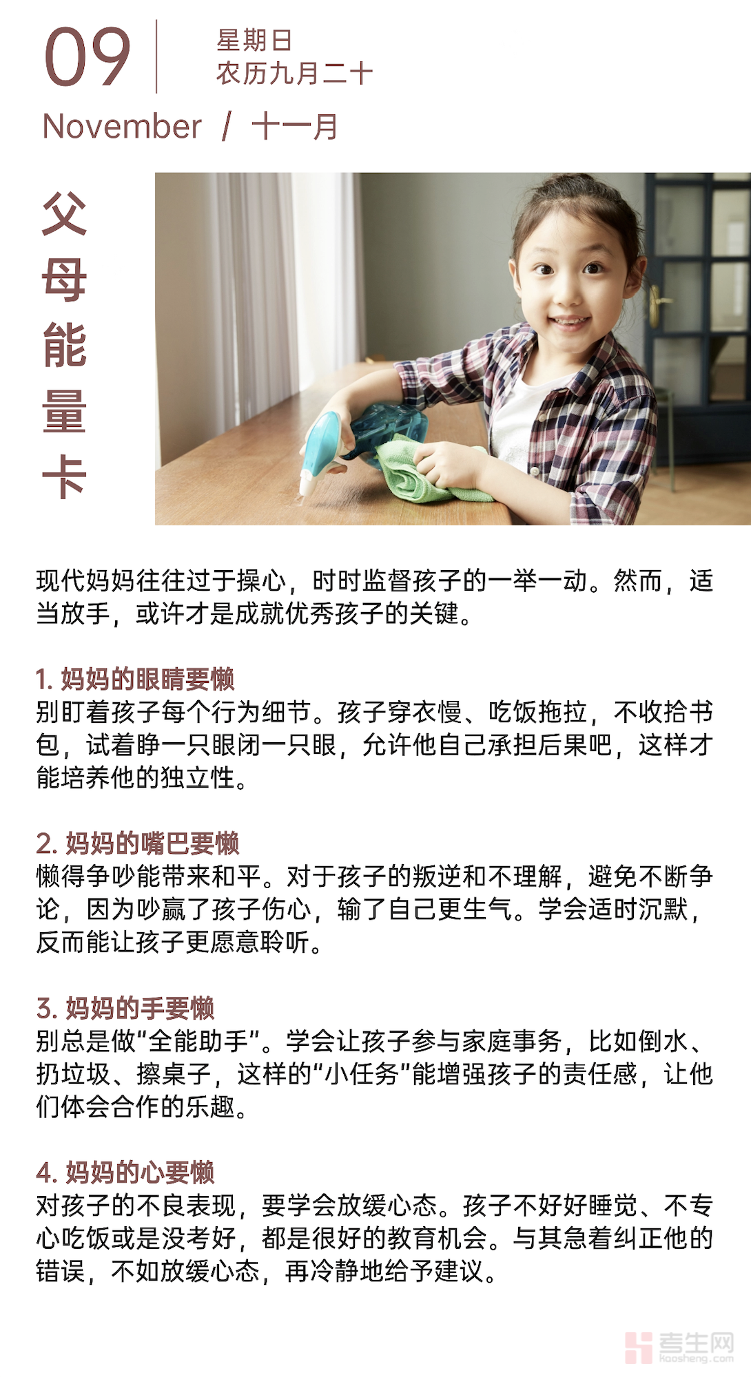 现代妈妈常常因过度操心、事事监督而疲惫,孩子也可能在这种 “密不透风” 的关注中失去独立成长的空间。本期考生网家校共育栏目带来的 “父母能量卡”,倡导妈妈们学会 “偷懒”,以适当放手的智慧,成就孩子的优秀与独立。