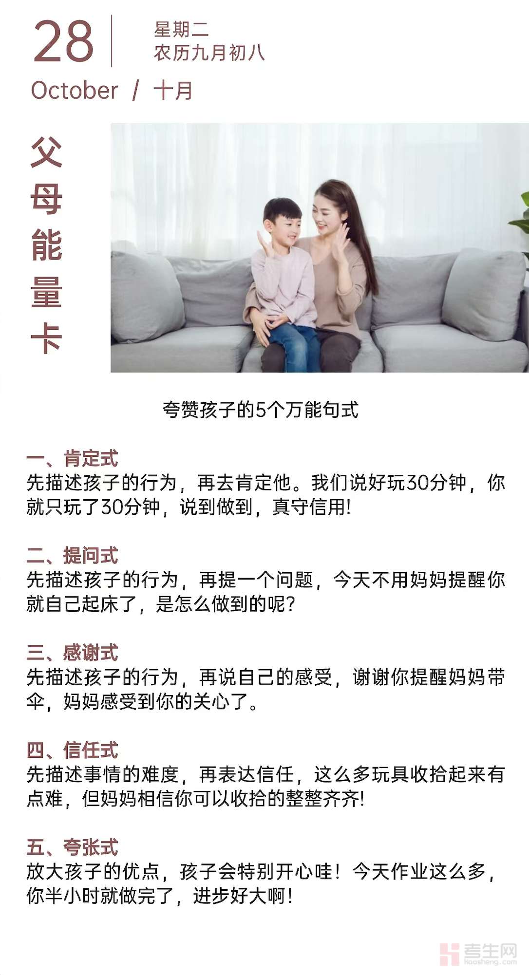 在家校共育的过程中,有效的亲子沟通是建立良好亲子关系、助力孩子成长的关键一环。今天为各位家长带来一张实用的 “父母能量卡”,解锁夸赞孩子的 5 个万能句式,让您的肯定与鼓励精准传递,成为孩子成长路上的 “正向燃料”。