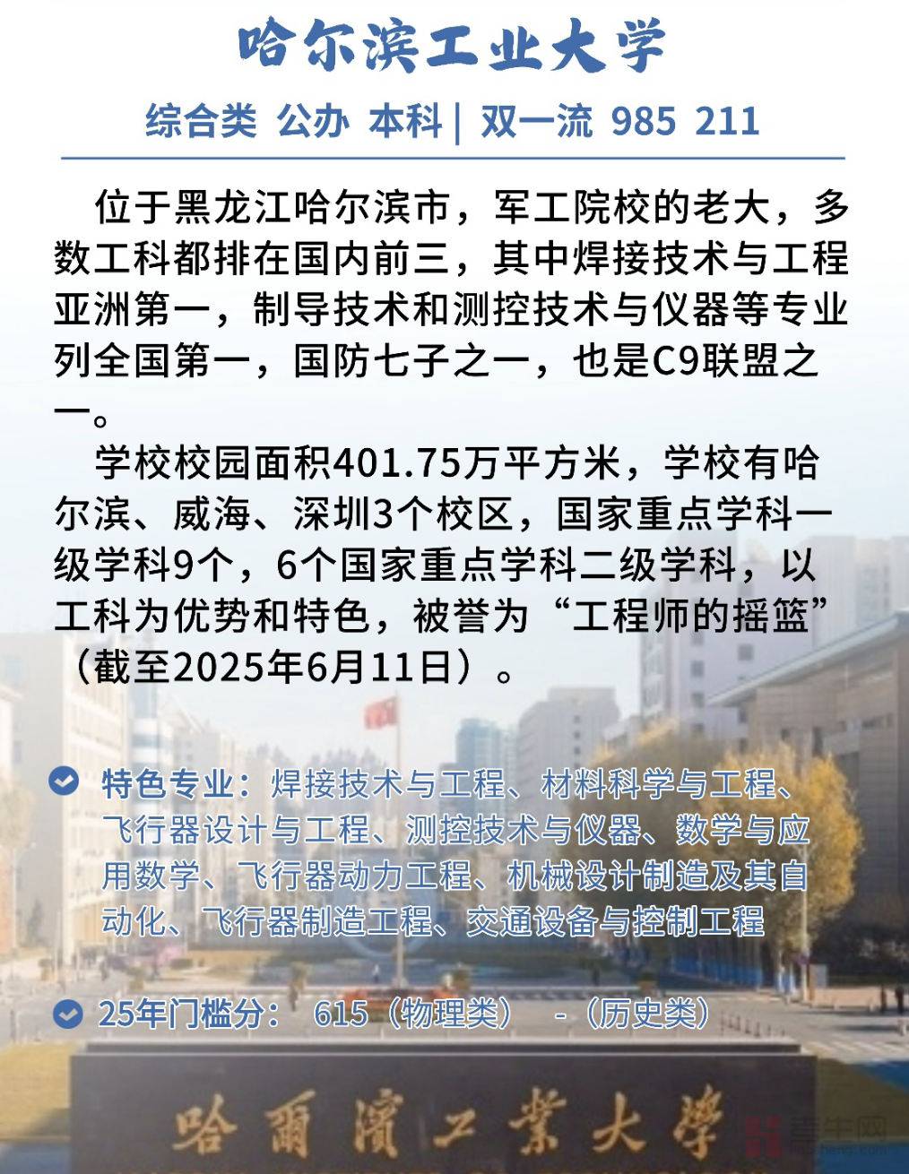 哈工大隶属于工业和信息化部,学校住所地为黑龙江省哈尔滨市南岗区西大直街92号,同时在山东省威海市和广东省深圳市分别设有校区。学校始建于1920年,1951年被确定为全国学习国外高等教育办学模式的两所样板大学之一,1954年进入国家首批重点建设的6所高校行列,被誉为“工程师的摇篮”。学校于1996年进入国家“211工程”首批重点建设高校,1999年被确定为国家首批“985工程”重点建设的9所大学之一,2000年与同根同源的哈尔滨建筑大学合并组建新的哈工大,2017年入选“双一流”建设A类高校名单,2022年8个学科入选新一轮“双一流”建设名单。