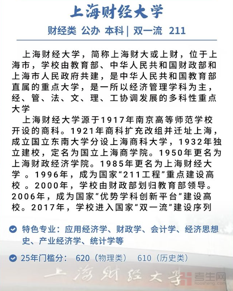 经过几代人的艰苦创业和努力奋斗,上海财经大学已成为一所以经济管理学科为主,经、管、法、文、理、工协调发展的多科性重点大学。学校占地812.9亩,共有三个校区,主校区位于国定路777号。现有各类在校生18174人,从学生分类看,全日制本科生8262人(含本科留学生212人),硕士生7393人(含留学生206人),博士生1419人(含留学生13人)。