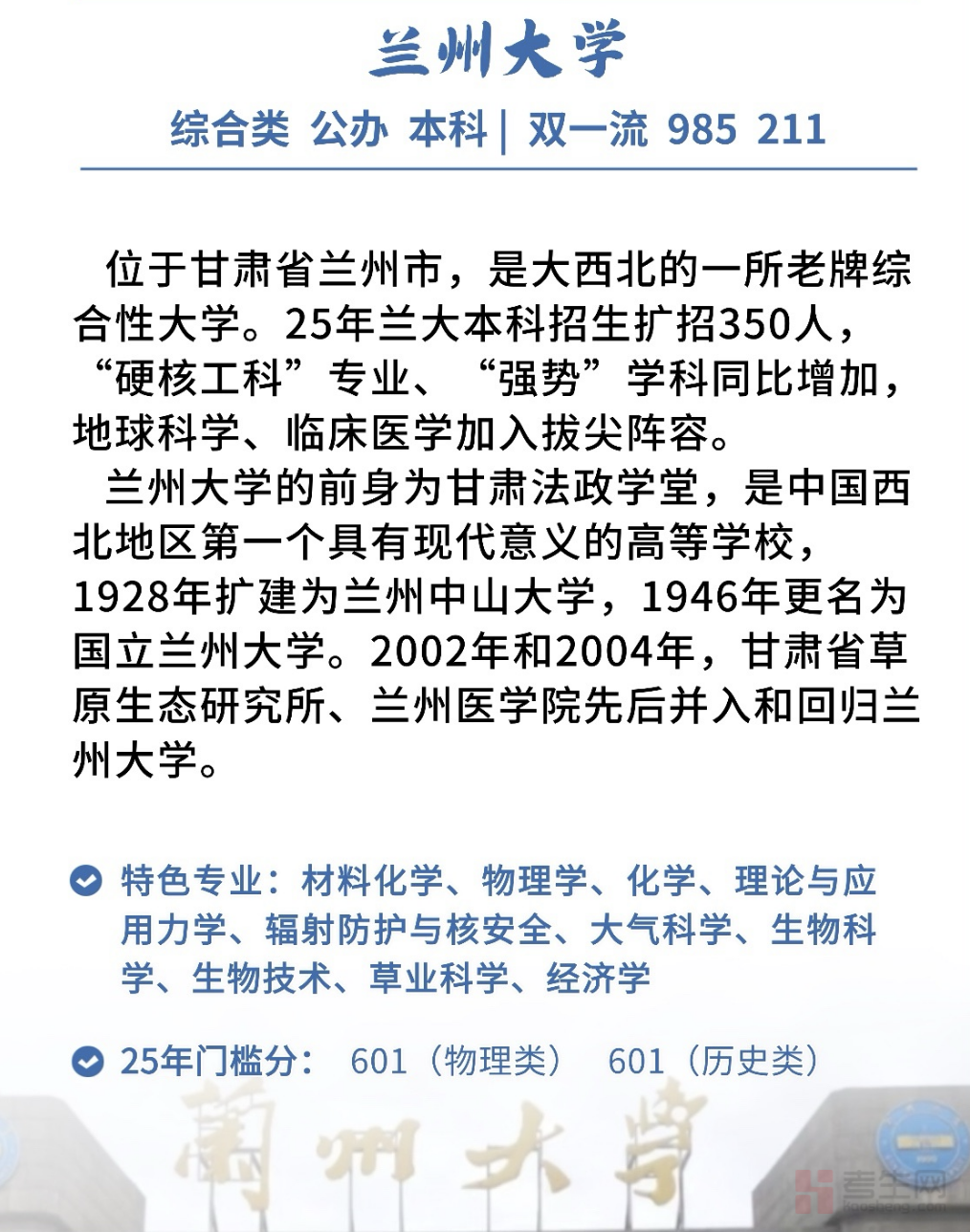 面向未来,兰州大学坚持以习近平新时代中国特色社会主义思想为指导,以建成中国特色、世界一流大学为目标,发扬“自强不息、独树一帜”的校训精神,不忘初心、牢记使命、坚守奋斗,致力于在中国西部大地书写建设教育强国的时代答卷,为以中国式现代化全面推进强国建设、民族复兴伟业作出新的更大贡献。(统计数据截止时间:2025年9月30日)