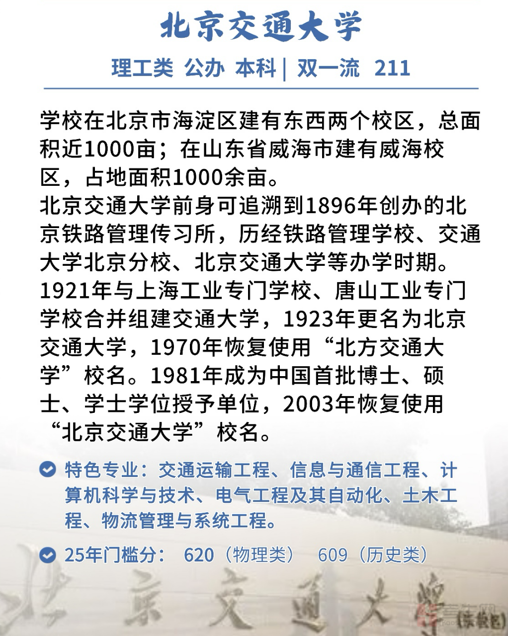 北京交通大学是教育部直属,教育部、交通运输部、北京市人民政府和中国国家铁路集团有限公司共建的全国重点大学,是国家“211工程”“985工程优势学科创新平台”“双一流”建设高校。