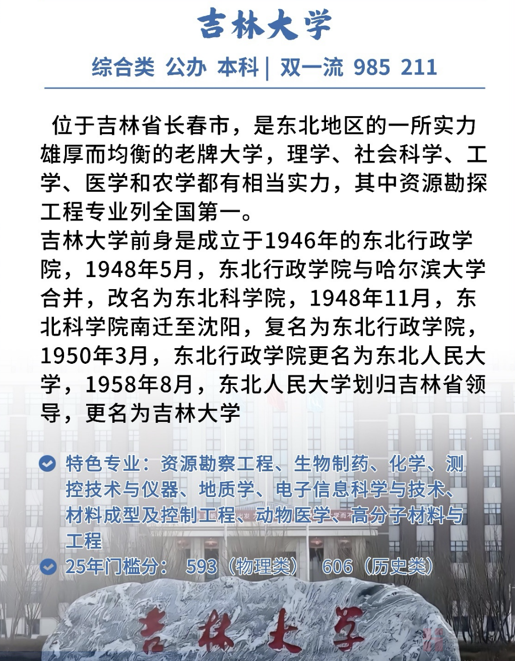吉林大学是教育部直属的全国重点综合性大学,坐落在吉林省长春市。学校始建于1946年,1960年被列为国家重点大学,1984年成为首批建立研究生院的22所大学之一,是国家“211工程”“985工程”和首批“双一流”大学建设高校。